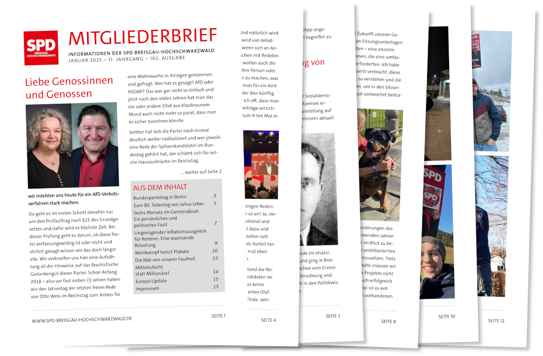 Es gibt aber auch noch viele anderes zu berichten: Jenny Beck erzählt von ihren ersten sechs Monaten im Gemeinderat in Umkirch und die AG60+ thematisiert den fehlenden Inflationsausgleich für die Rentner. In Breisach gibt es eine tolle Ausstellung zu Julius Leber, während Arbeitgeberverbände uns alle als Krankfeierer denunzieren. Die DAK und andere halten dagegen.